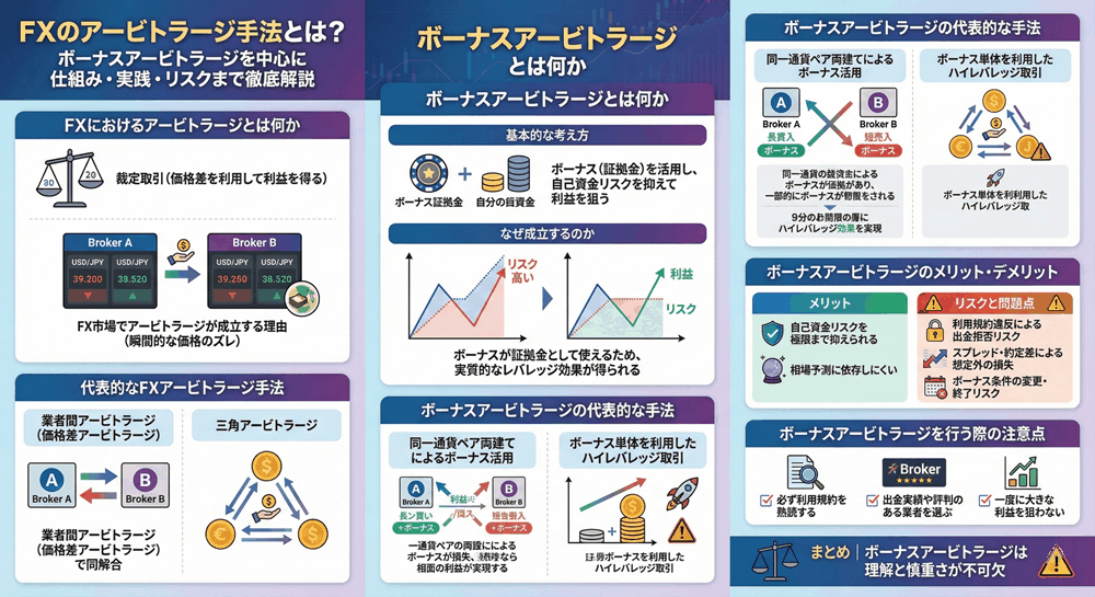本記事では、FXにおけるアービトラージの基本概念から、代表的な手法、そして近年話題となるボーナスアービトラージの仕組み・実践方法・メリットとデメリット・リスクや注意点までを、体系的かつ深掘りして解説します。